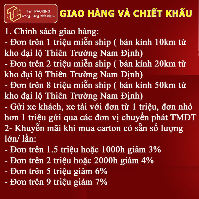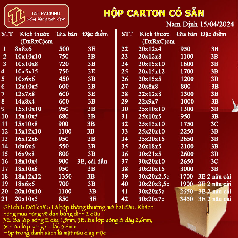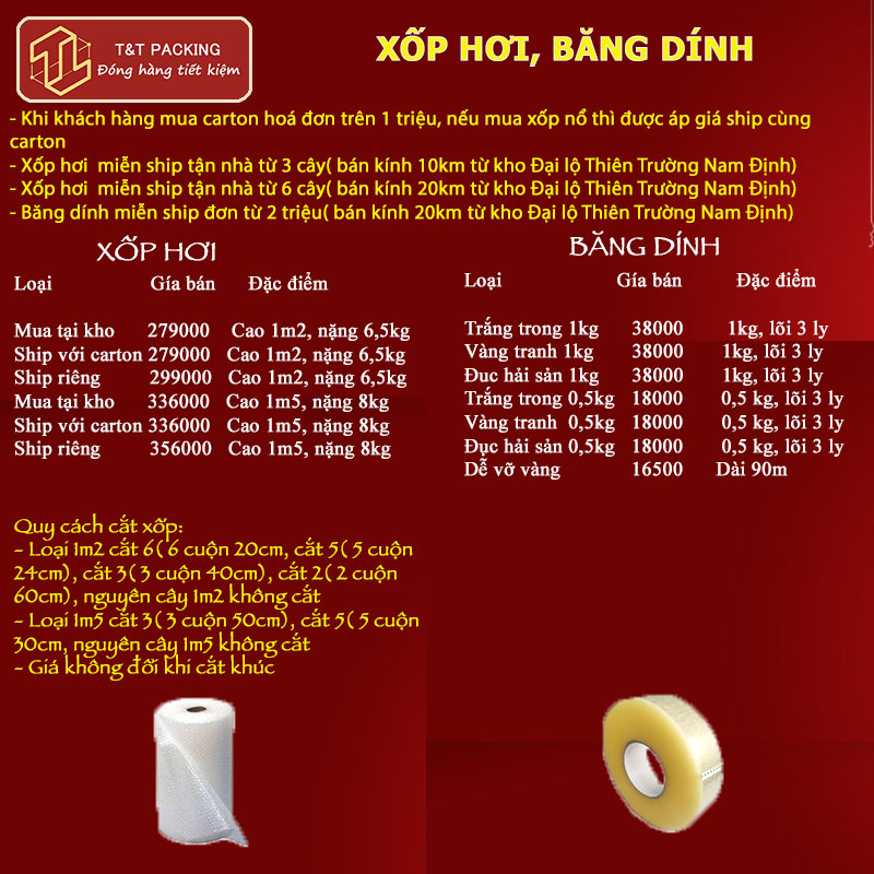Công ty cổ phần T&T Packing cập nhật báo giá carton xốp hơi băng dính cập nhật mới nhất ngày 15/04/2024 tại NAM ĐỊNH và các tỉnh lân cận.